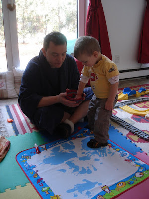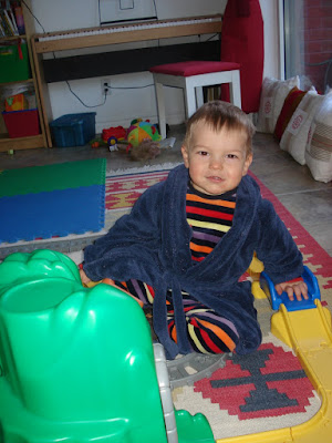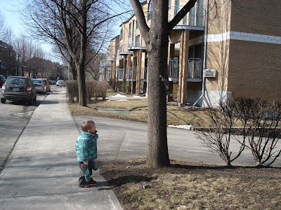 Mais le bon coté, c'est que ça fait fondre la neige qu'il reste dans la rue, et puis après tout, on a décidé d'en profiter, alors on a sorti nos bottes et on est allés sauter dans les flaques d'eau. Inutile de vous dire que Timmy a aimé la sortie! Pas de photo de cela, mais je vous laisse imaginer, Timmy plein de boue et tout mouillé. Le fun! Il adore aller dehors, et voir les voitures ou camions passer dans la rue. Et les gros camions il aime vraiment ça! Ce qui est plus embêtant de bon matin quand je le dépose à la garderie et qu'il reste scotché devant un gros 10 tonnes ... dur de le faire bouger...