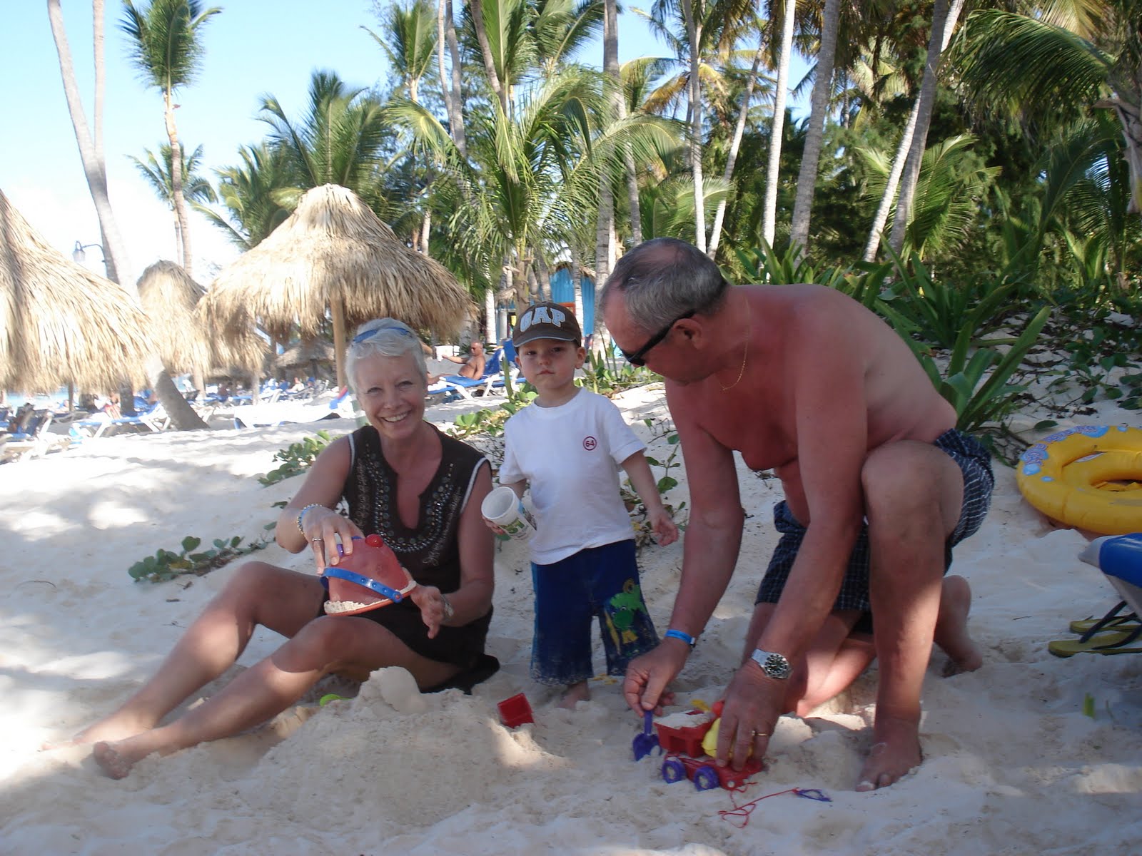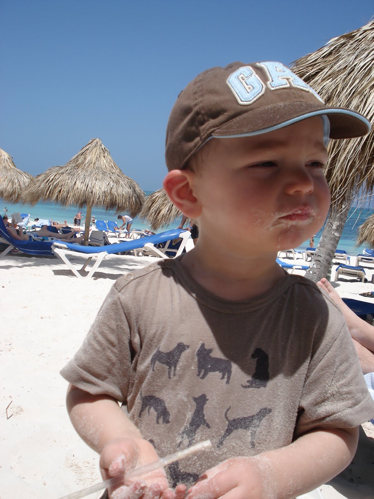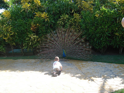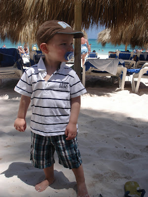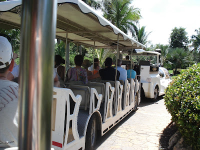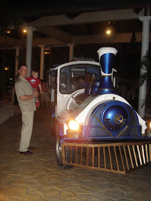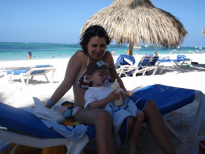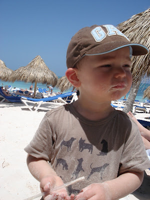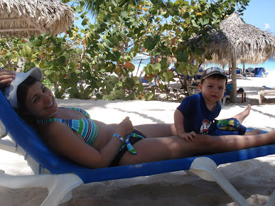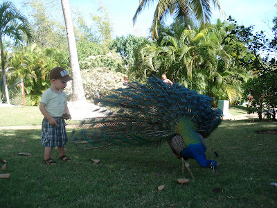 Le site de l'hôtel était superbe, la mer chaude et belle, la nourriture vraiment très bonne, nous avons eu beau temps toute la semaine (30 degrés!), et les Dominicains sont très gentils. En somme, une semaine bien agréable. On a bien profité et Timothée aussi! Il s'est bien fait au soleil, et s'est découvert une passion pour les paons. Il y en avait beaucoup sur le site de l'hôtel. Il s'est aperçu que, tout comme lui, les paons aiment les muffins au chocolat, et a donc partagé quelques muffins tous les jours avec eux... Il a aussi trouvé que le sable des caraïbes avait bon gout (photo à l'appui...). Il a bien apprécié les repas au bord de la mer (et nous aussi) et a bien occupé son papi et sa mamie (et nous on en a profité!). Il a adoré prendre le train (le site étant grand, c'était le moyen de transport par prédilection). J'ai pu bronzer. Steph a apprécié les cocktails sur la plage. Martine et Philippe ont demandé à rester une semaine de plus. Bref, tout le monde y a trouvé son compte!