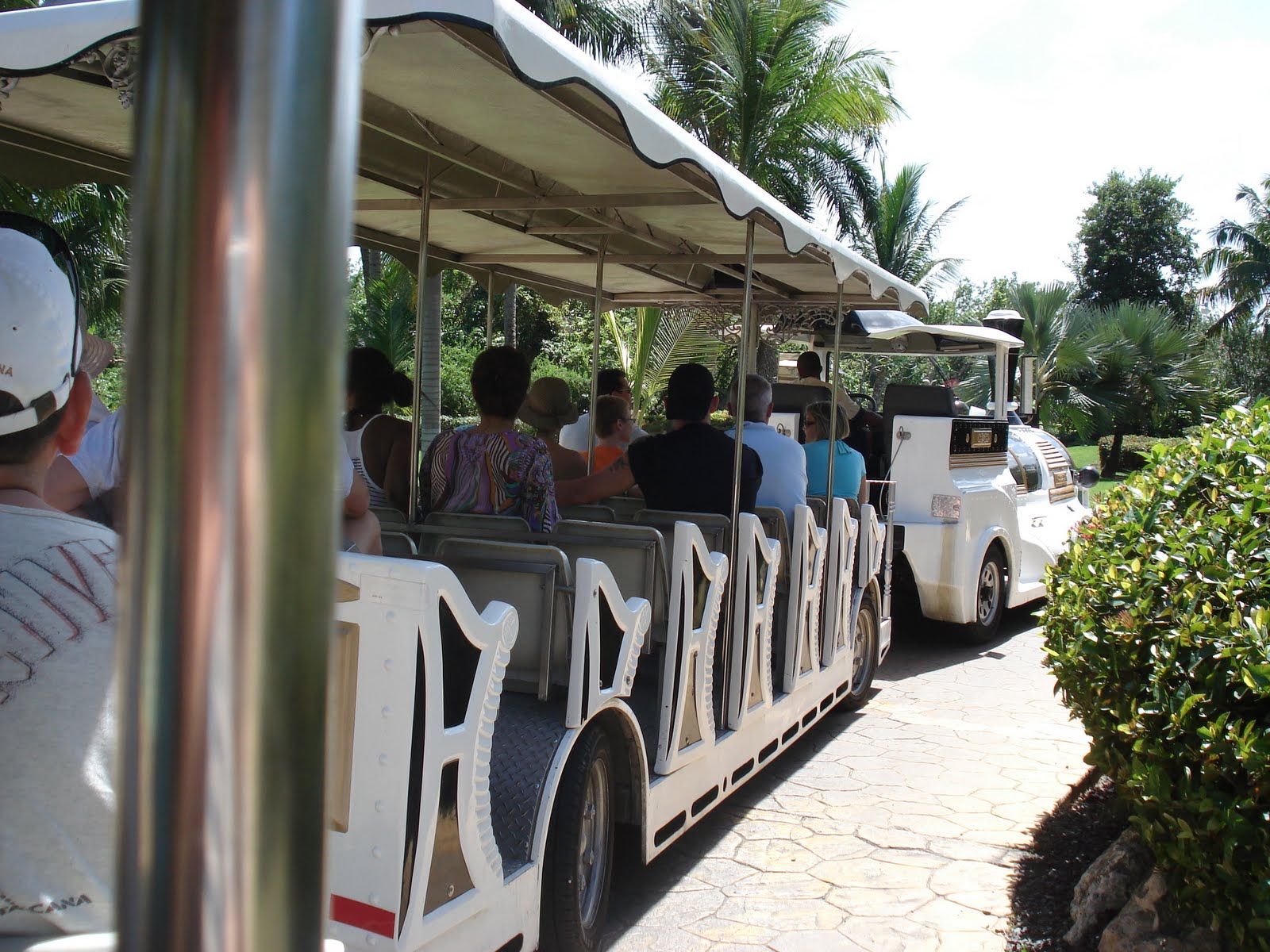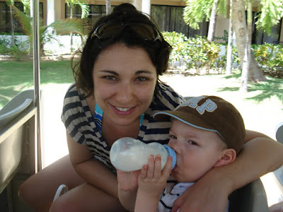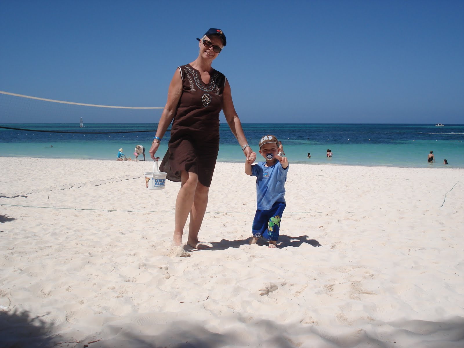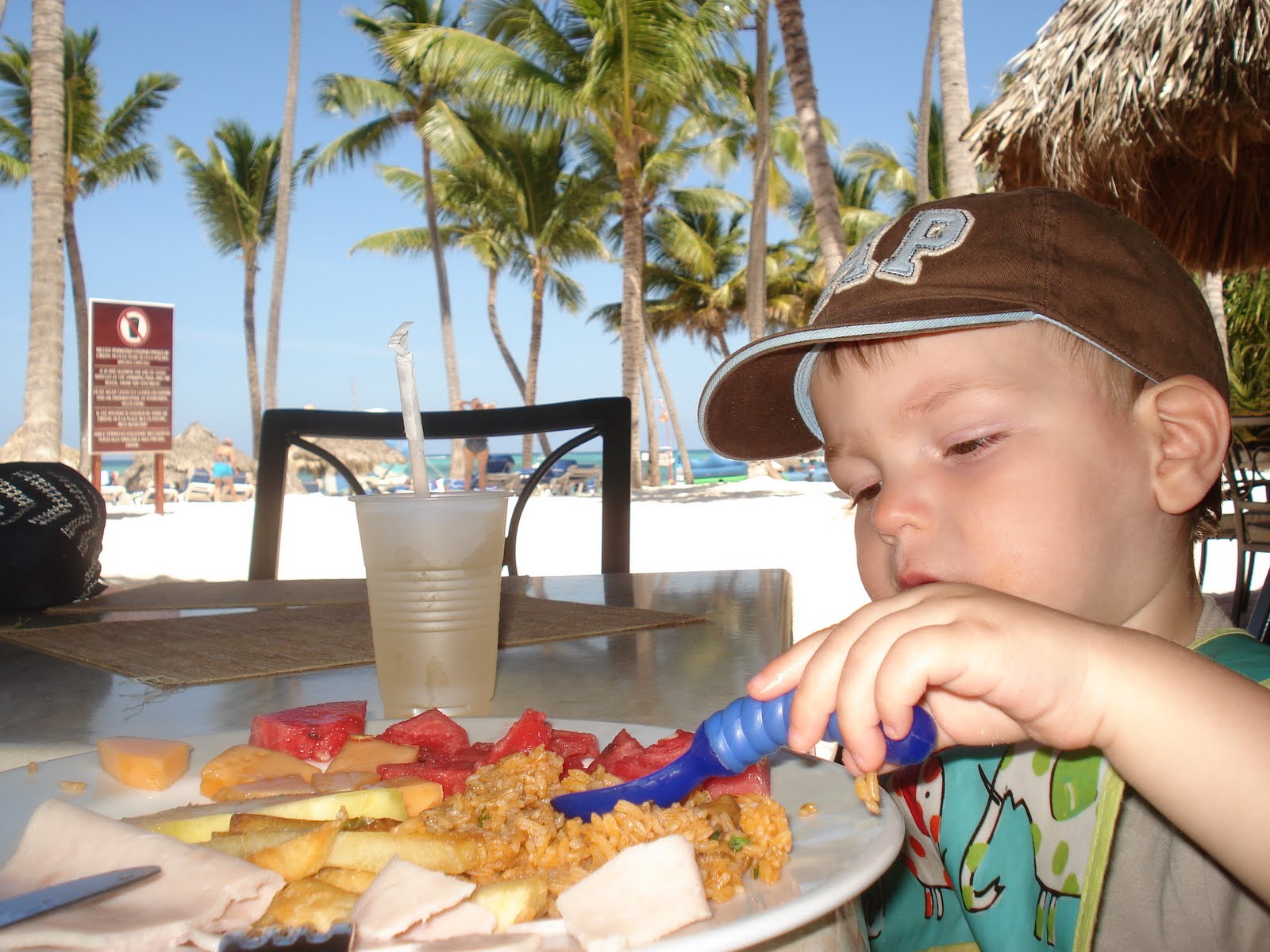 Le site de l'hôtel était superbe, la mer chaude et belle, la nourriture vraiment très bonne, nous avons eu beau temps toute la semaine (30 degrés!), et les Dominicains sont très gentils. En somme, une semaine bien agréable. On a bien profité et Timothée aussi! Il s'est bien fait au soleil, et s'est découvert une passion pour les paons. Il y en avait beaucoup sur le site de l'hôtel. Il s'est aperçu que, tout comme lui, les paons aiment les muffins au chocolat, et a donc partagé quelques muffins tous les jours avec eux... Il a aussi trouvé que le sable des caraïbes avait bon gout (photo à l'appui...). Il a bien apprécié les repas au bord de la mer (et nous aussi) et a bien occupé son papi et sa mamie (et nous on en a profité!). Il a adoré prendre le train (le site étant grand, c'était le moyen de transport par prédilection). J'ai pu bronzer. Steph a apprécié les cocktails sur la plage. Martine et Philippe ont demandé à rester une semaine de plus. Bref, tout le monde y a trouvé son compte!