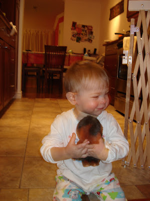À part ça, il développe de plus en plus son langage et répète tout ce qu'on dit (à sa manière). C'est super! En plus il reconnait tous les animaux sur son mur et les montre quand on les nomme. Pourtant y'en a des pas faciles! Alors il reconnait : crocodile, lapin, poisson, guépard, éléphant, hippopotame, girafe, taupe, oiseau (bref, ce sont des autocollants thématiques "Arche de Noé"). Par contre il a tendance à confondre "papa" et "maman" quand il nous appelle et nous montre du doigt, et tout à l'heure, il m'a montrée quand Steph a dit "il est où l'éléphant?". Oups, y'a encore du boulot...