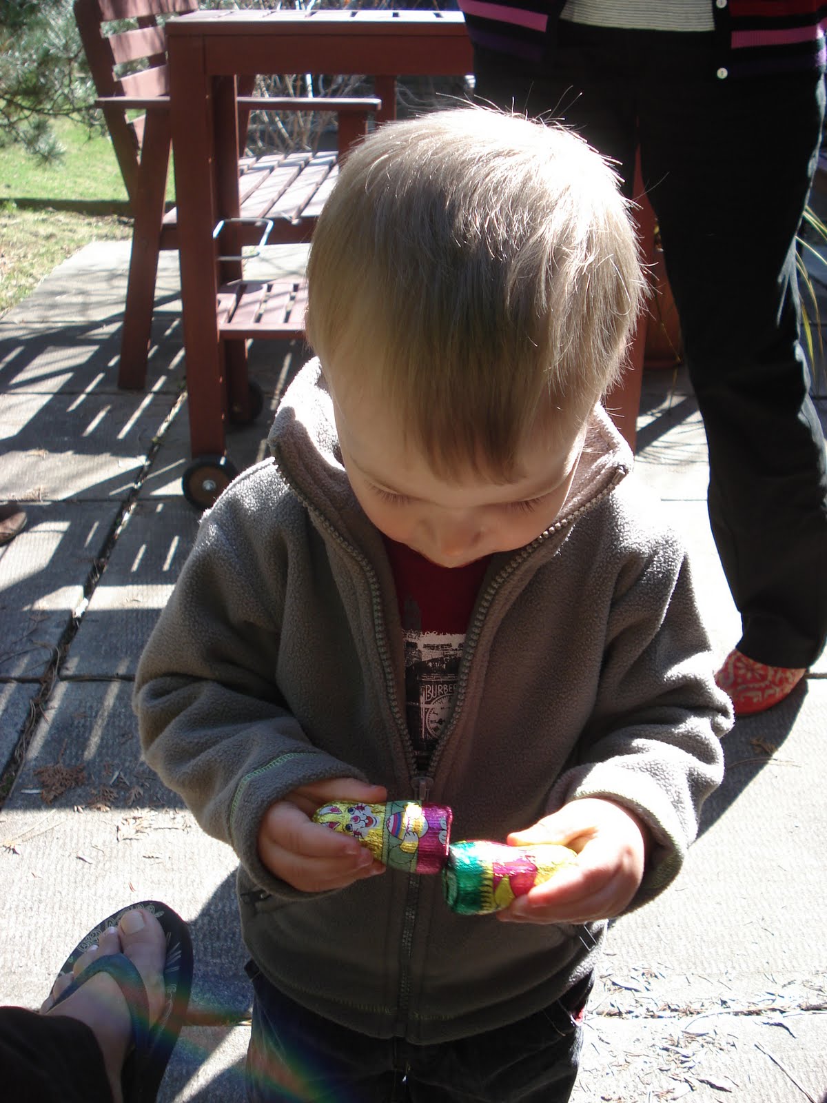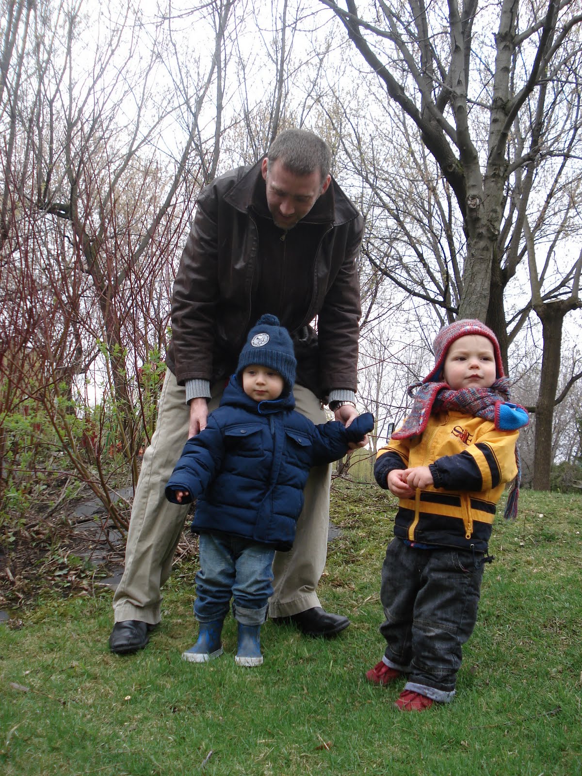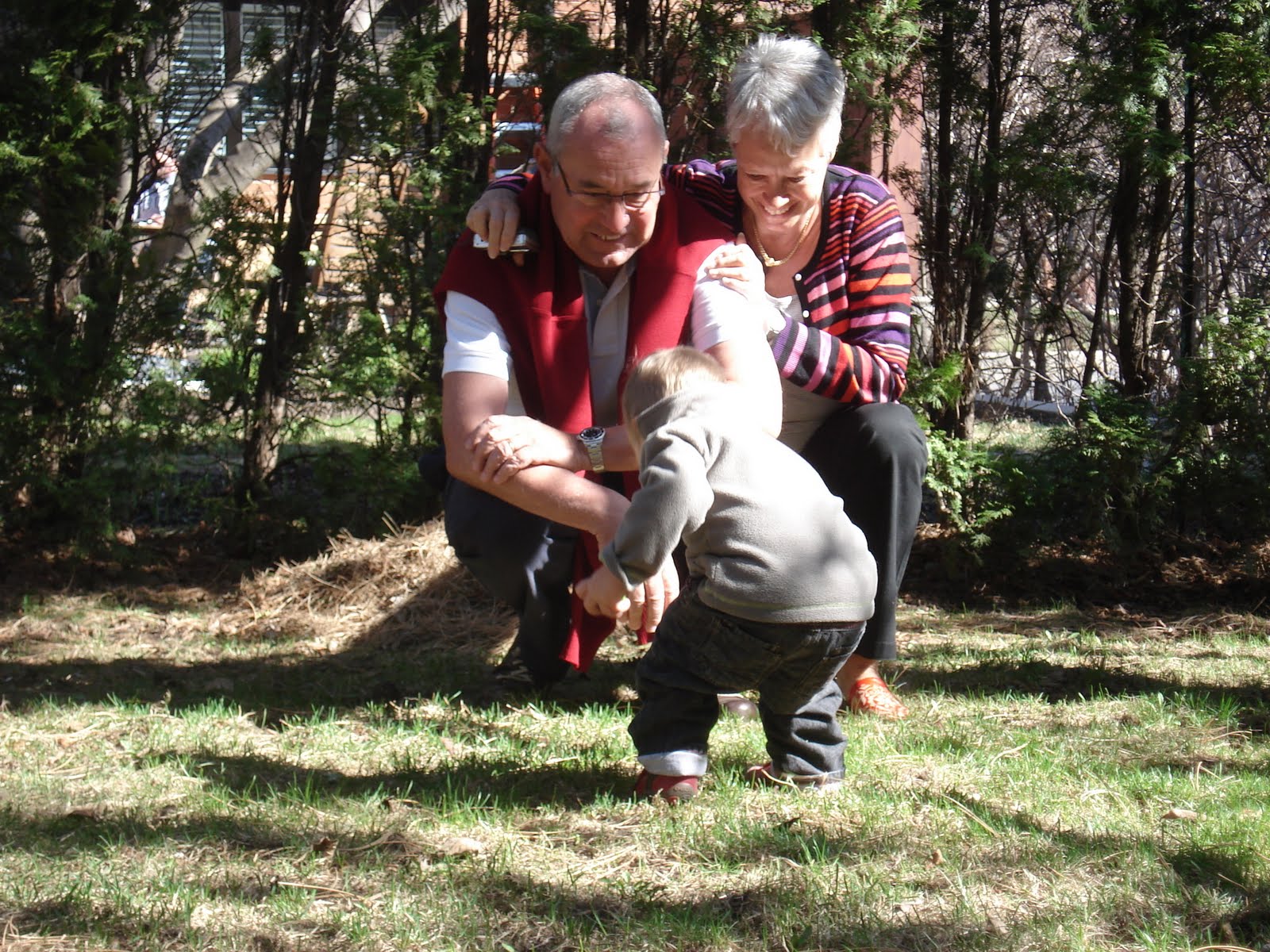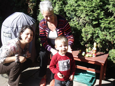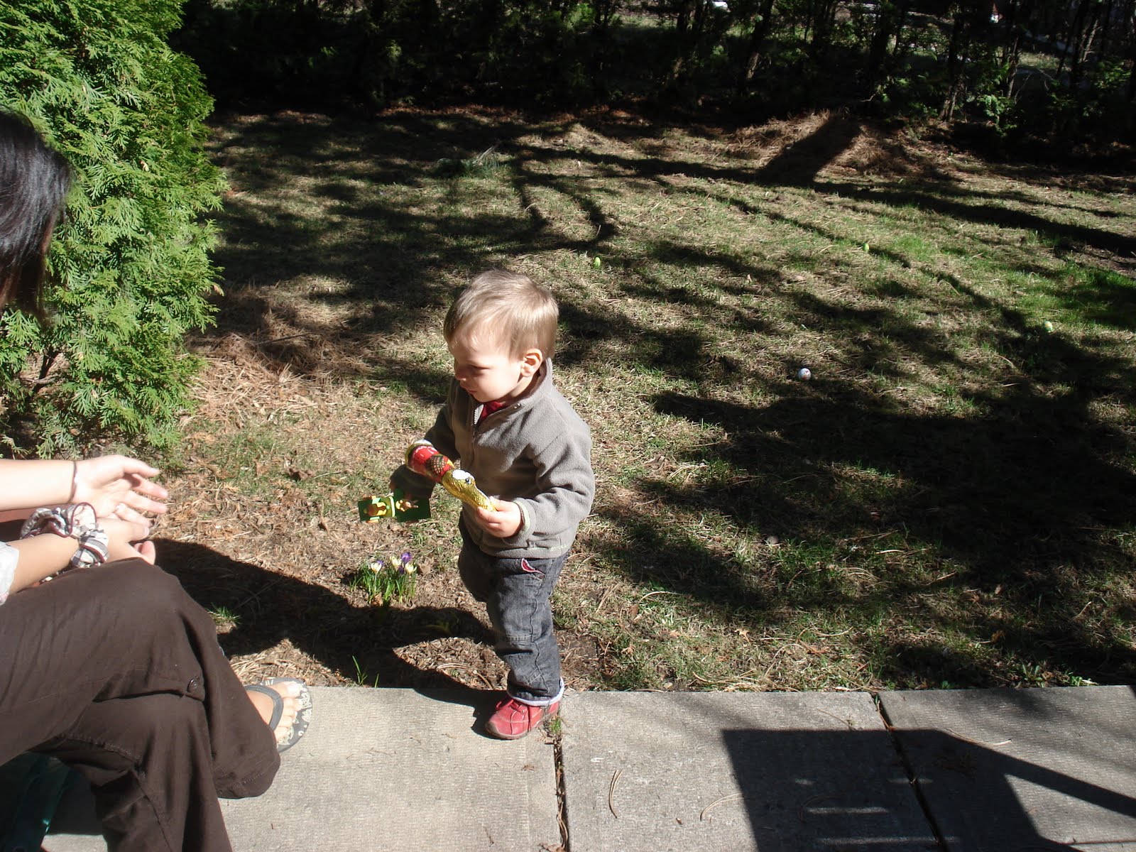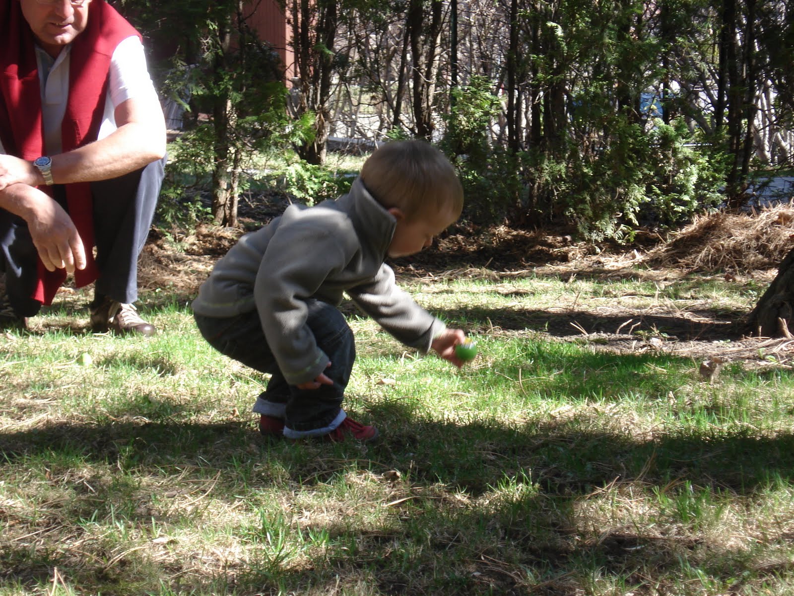 Nous avons eu un temps magnifique ce week-end et avons fêté Pâques dignement. C'est la première fois depuis que nous habitons au Canada que nous fêtons Pâques. À vrai dire c'est la première fois que nous avons des invités à ce moment là alors cela aide (les parents de Stéphane sont avec nous)! Papi a décoré le jardin de lapins, poules et oeufs certifiés "moins de 2 ans" (entendre par là "assez visibles"). Timothée les a tous trouvés, les apportant un par un à sa maman à chaque trouvaille... Il s'est régalé, et nous aussi!