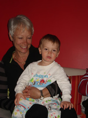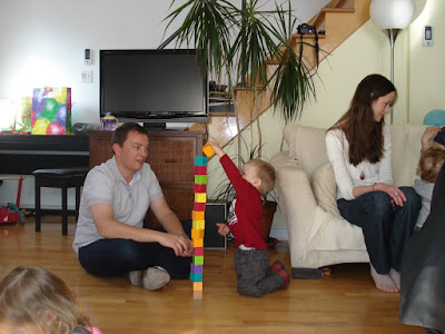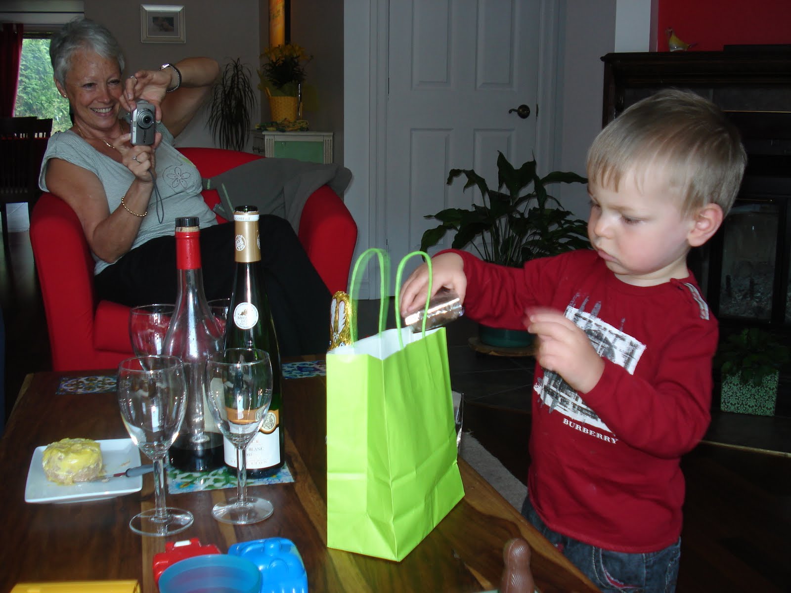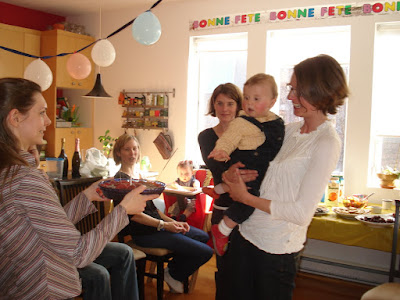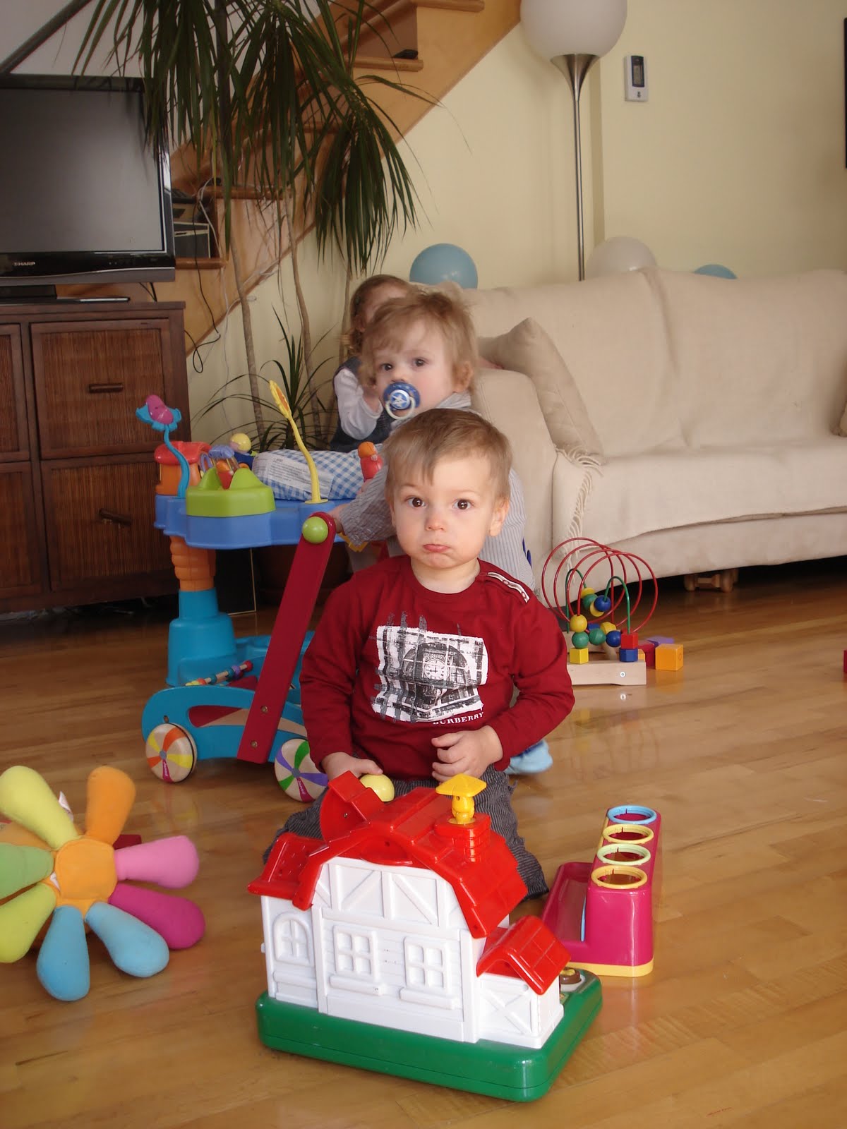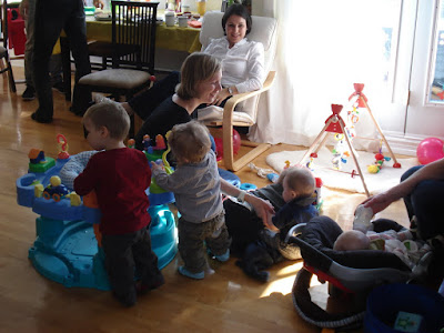 Nous avons aujourd'hui fêté les "un an" de Nathan, fils de nos amis Lise et Jérôme. Il y avait des enfants partout! 9 au total! Un salon transformé en garderie pour l'occasion, des jouets partout, des gâteaux, des bonbons, et des parents pour surveiller, ouf!