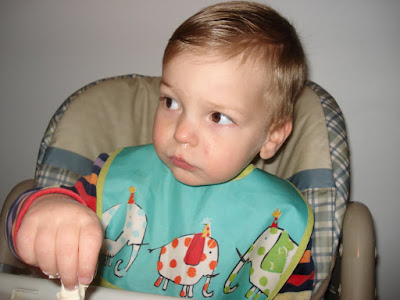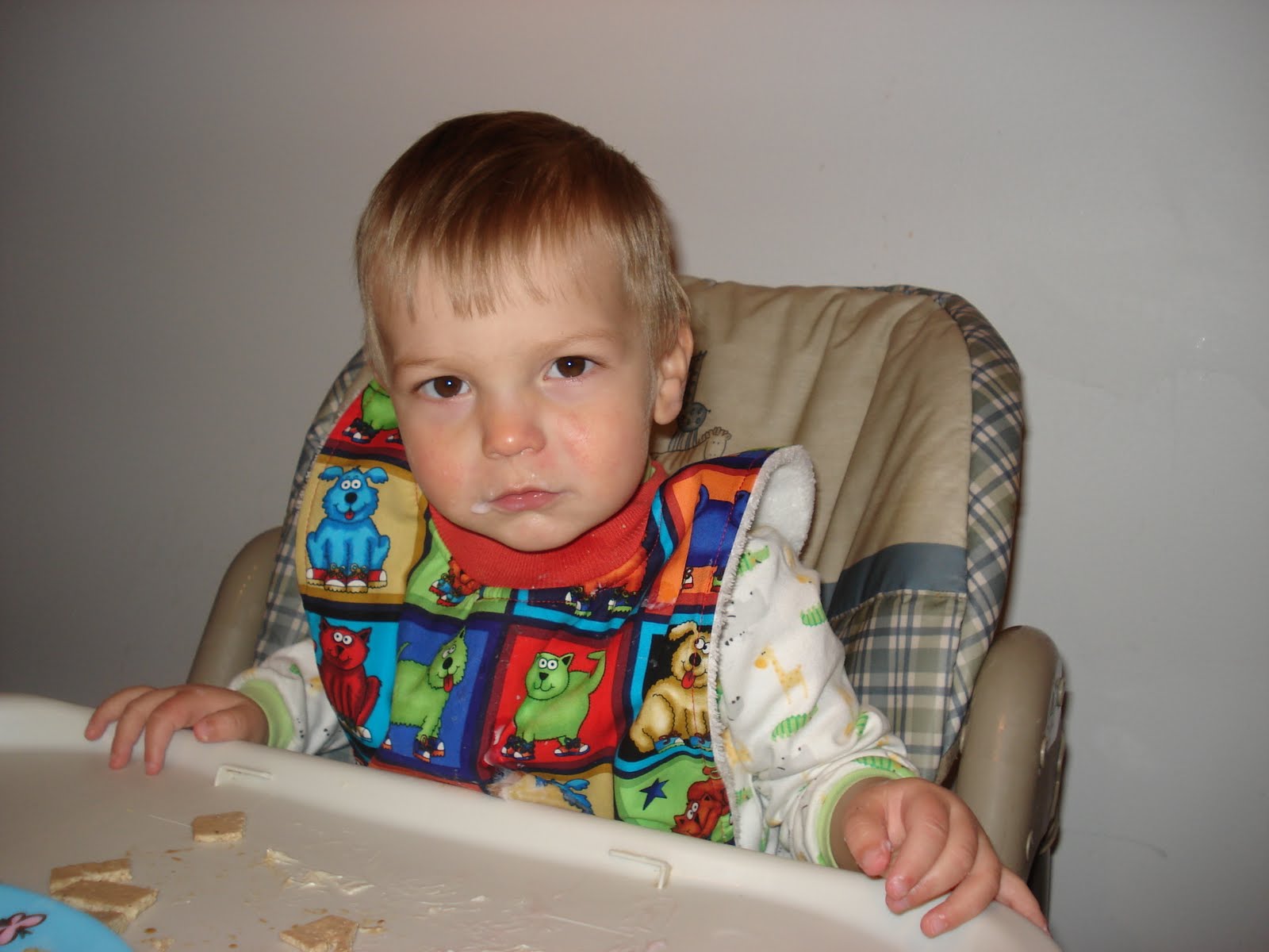Cette semaine a été marquée par un grand événement : Timothée est enfin passé dans la classe des grands à la garderie. Nous attendions ce moment depuis ses 18 mois en janvier, mais il n'y avait pas de place chez les plus grands. Maintenant il mange à une petite table, assis sur une petite chaise (et non plus dans une chaise haute), il fait la sieste sur un matelas par terre (et non plus dans un lit à barreau) et il fait des activités de plus grands. Il a enrichi son vocabulaire dernièrement avec main, pain, bain, "do" (de l'eau) et "to" (auto). Il se retourne sur tout ce qui bouge dans la rue : voitures, bus, passants, chiens... Coté animaux, on lui a offert un bavette chien et il adore! Coté beauté, il adore qu'on le coiffe et nous laisse lui faire la raie sur le coté!