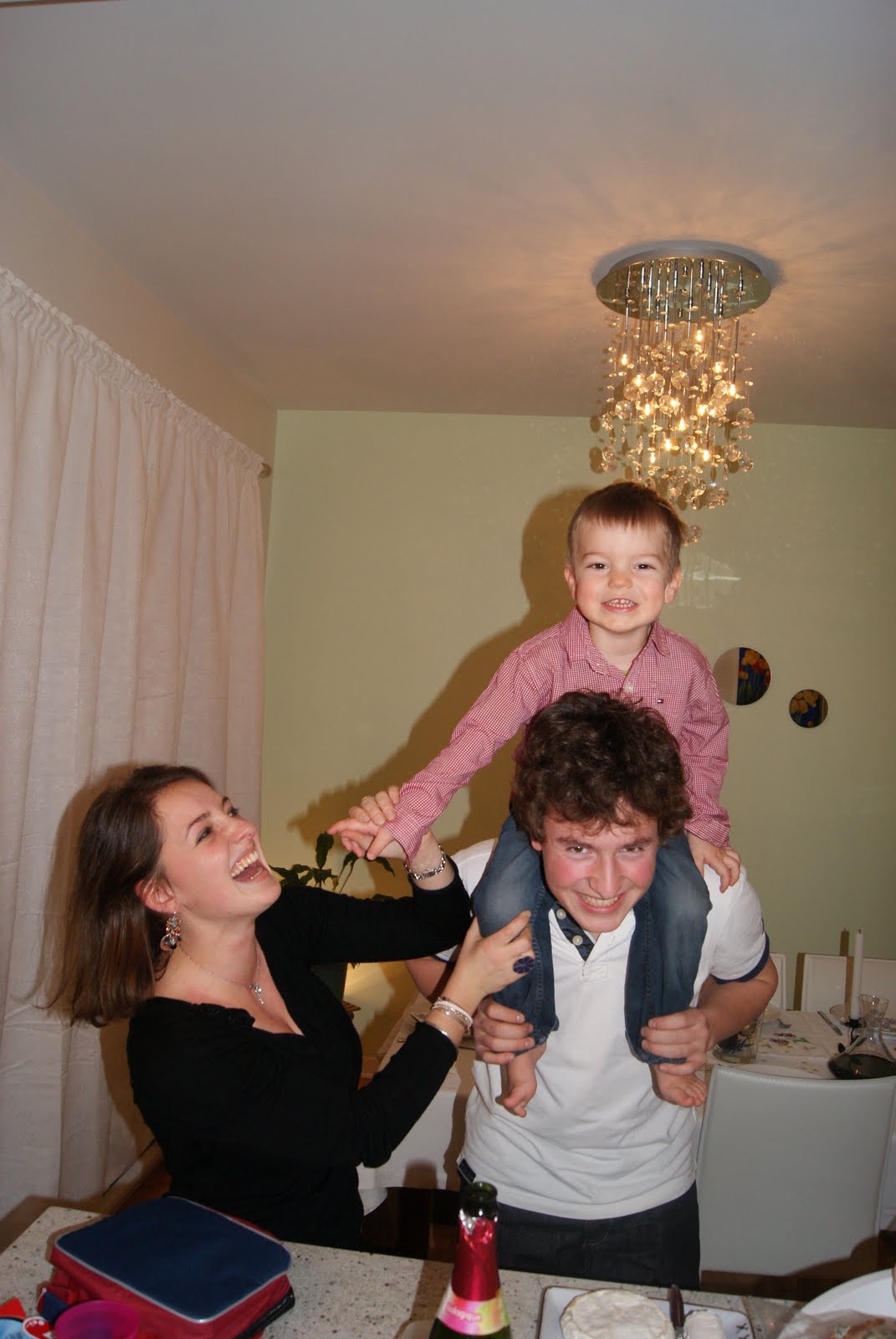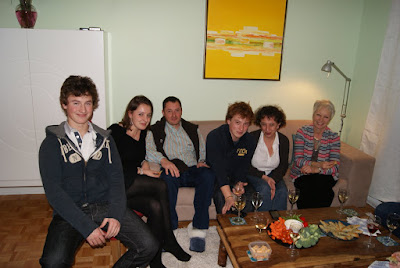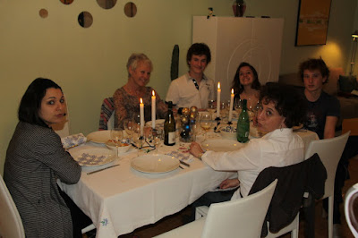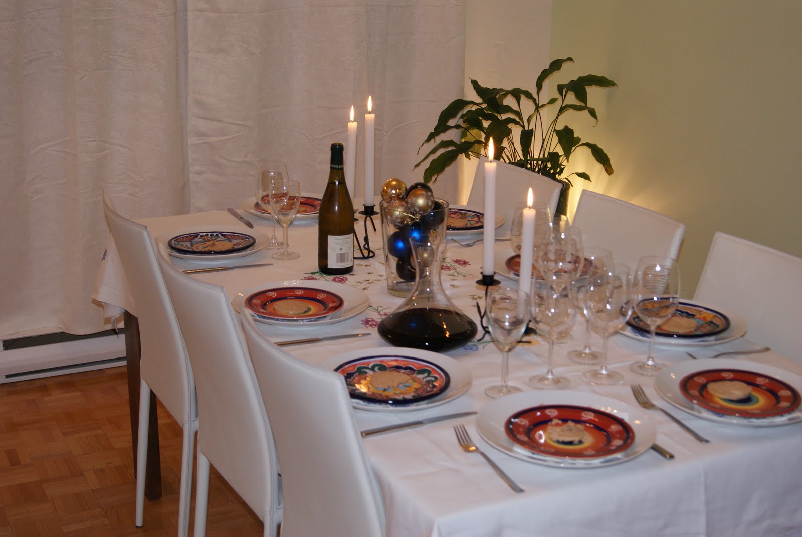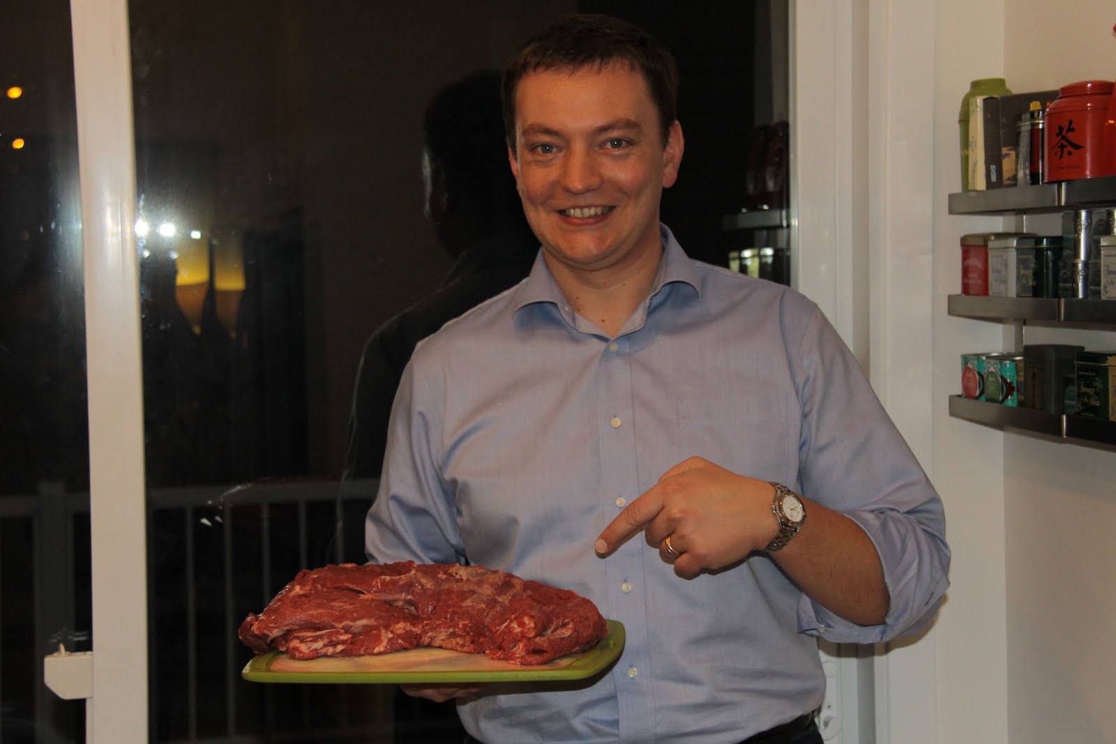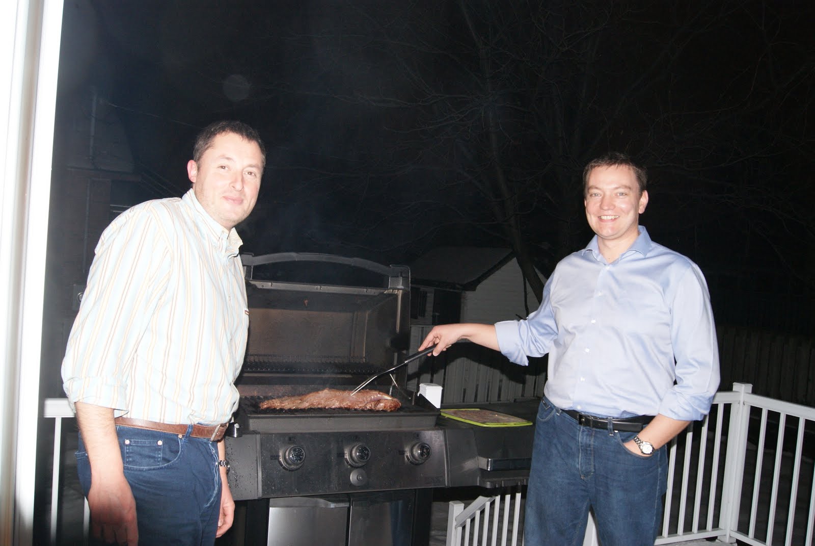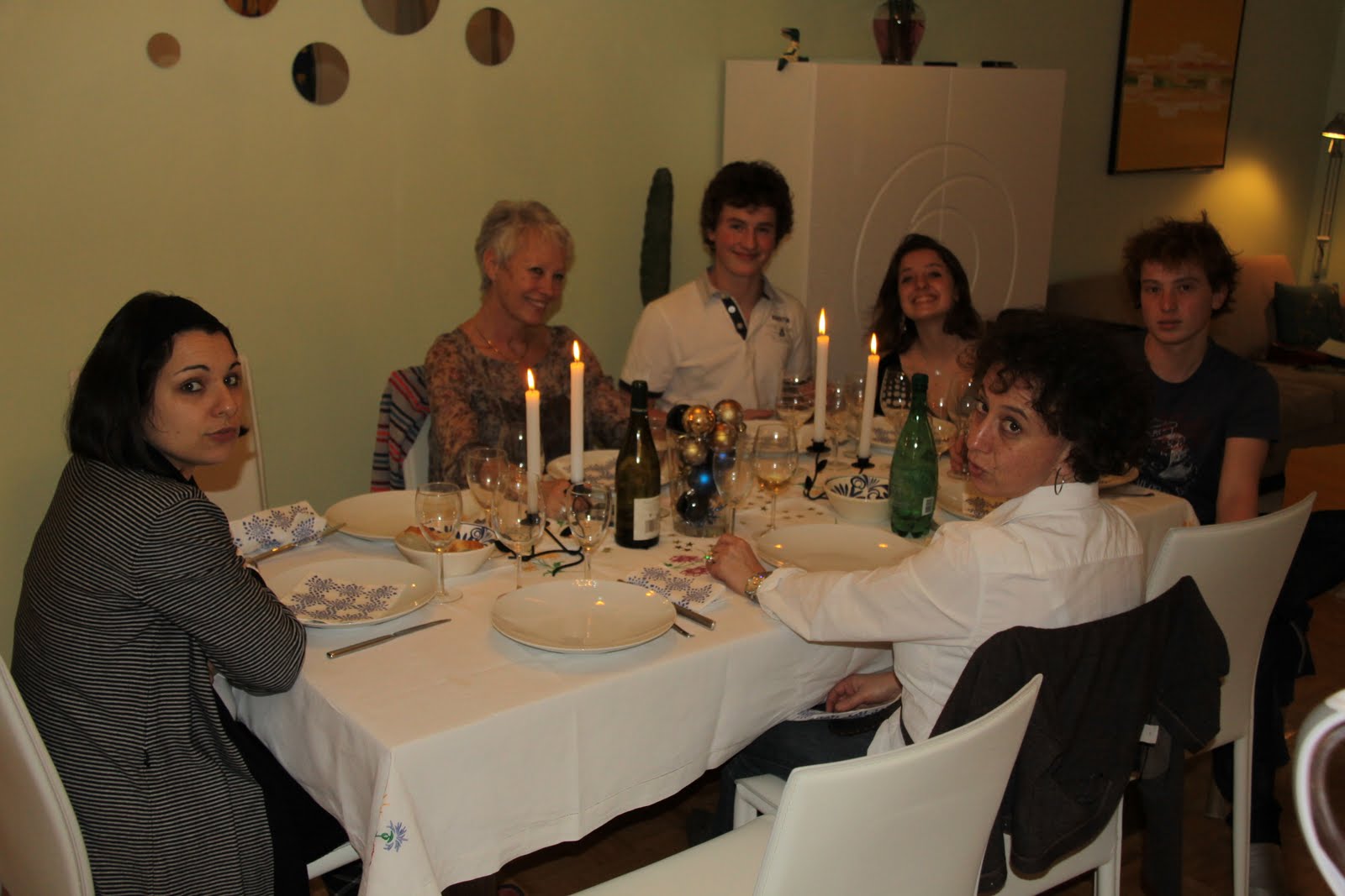 Nous étions 9 pour souper à la maison, si si! Et 9 maintenant, ça tient sur notre nouvelle table (car avant, déjà à 4, on était assez intimes merci...). Nous avions une magnifique pièce de viande, qui a eu la chance d'être cuite... au barbecue ! Seule solution qu'on a trouvée. Heureusement, il ne faisait pas trop froid dehors :-)