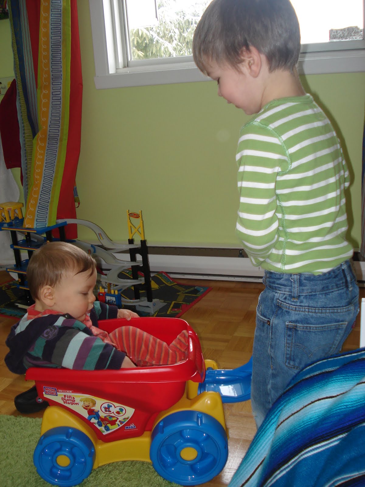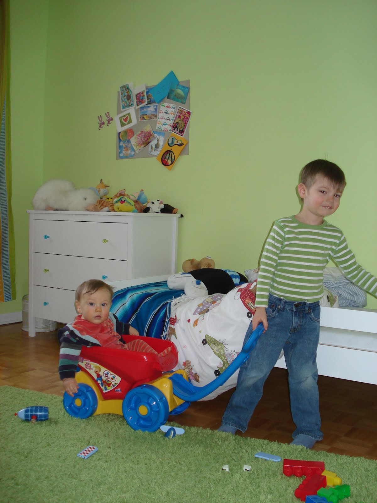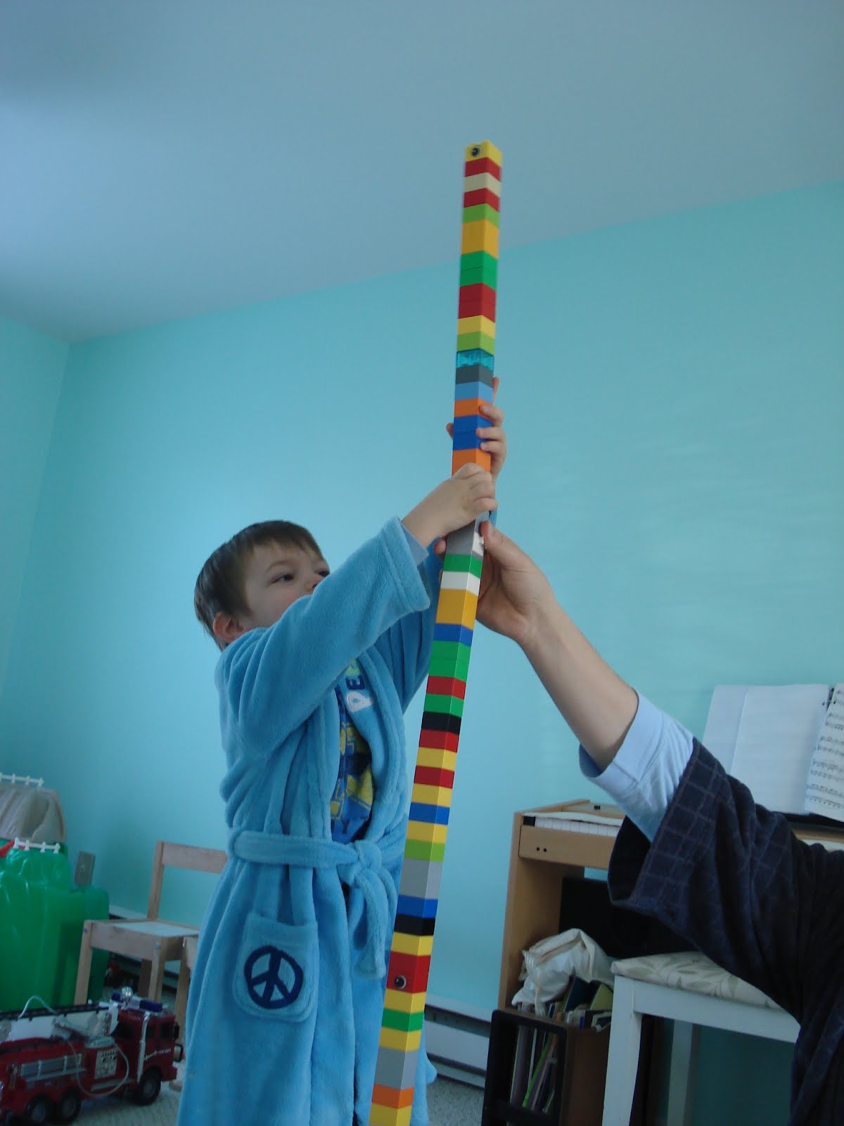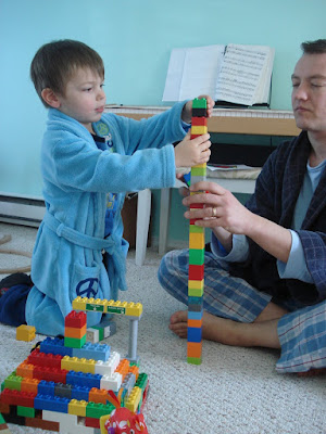 Timothée lui est dans sa phase dinosaures. Il sait tout sur le tyrannosaure, le stégosaure et le pinacosaurus (et c'est lui qui vient de me donner leurs noms!), et il rapporte régulièrement le soir de la garderie lesdits dinosaures en version plastique. Bon, la, ça me dépasse... Moi en dino j'y connais rien, alors je le laisse en discuter avec son papa... D'ailleurs avec son papa, ils font aussi de grandes grandes tours en Lego.Photo à l'appui...
