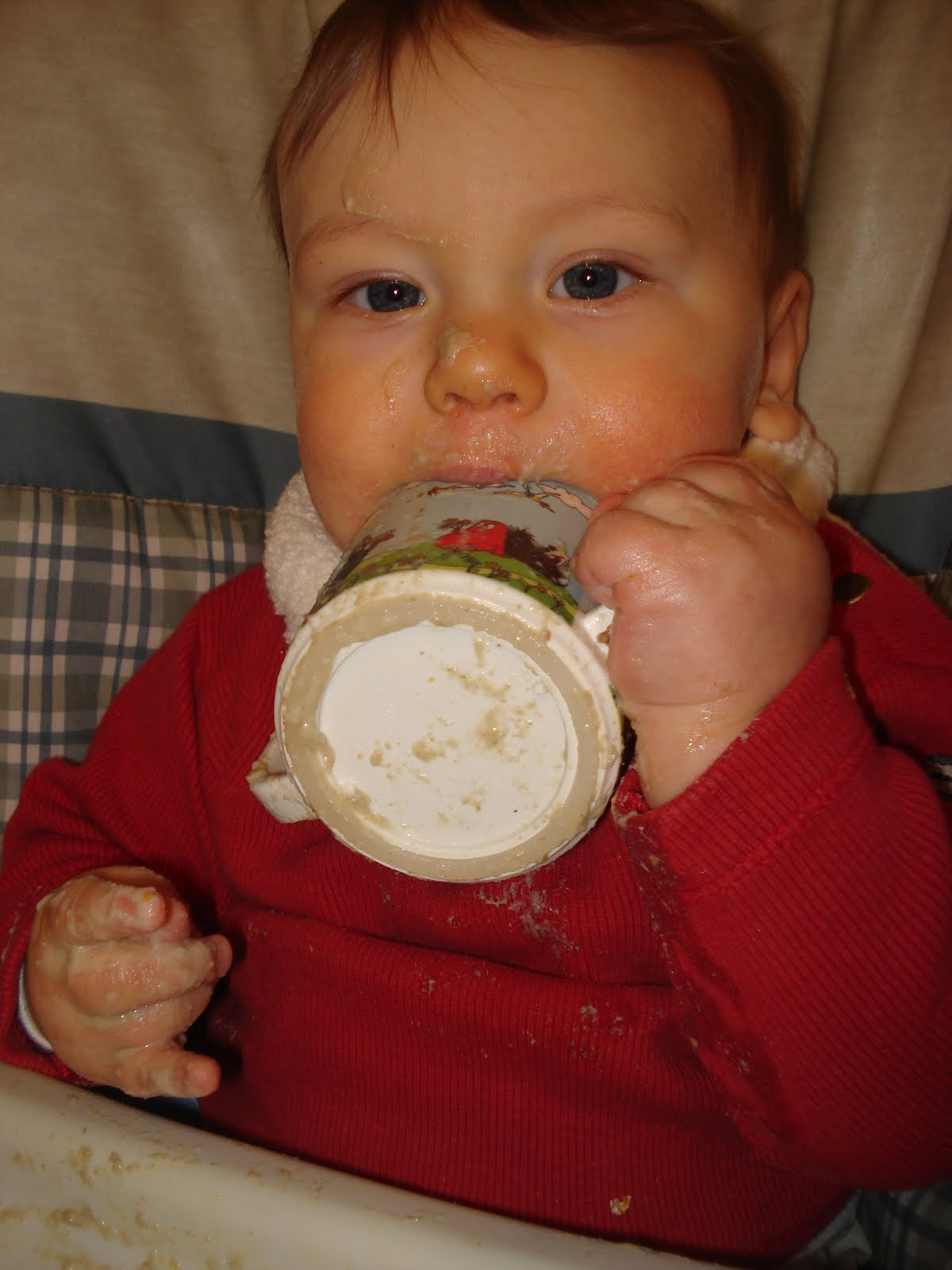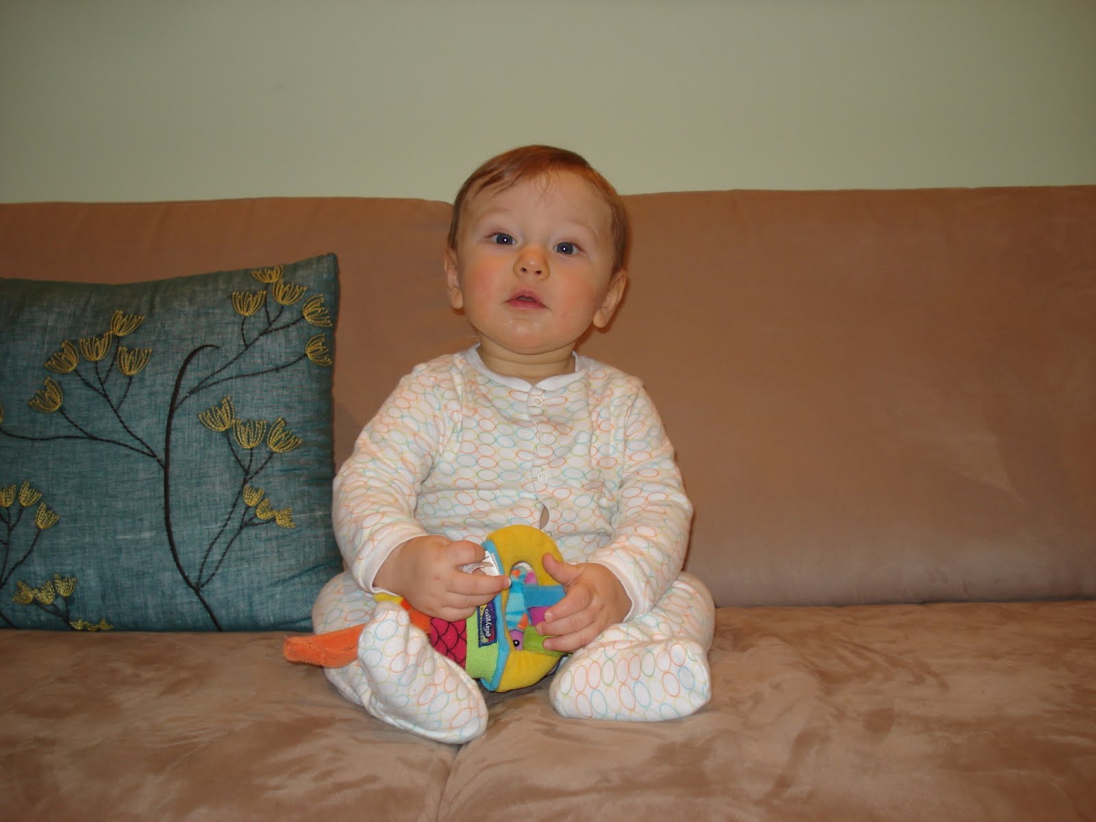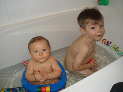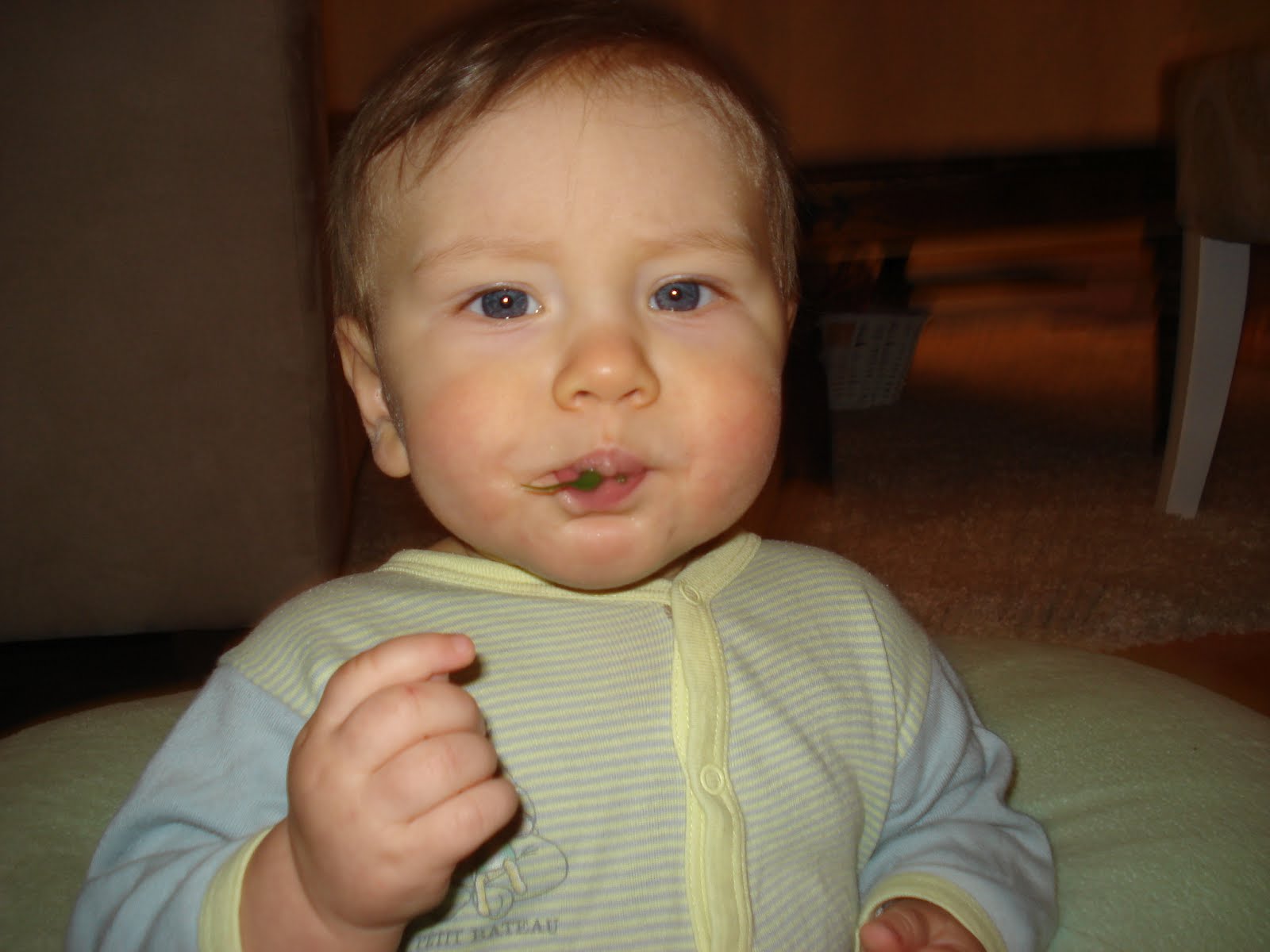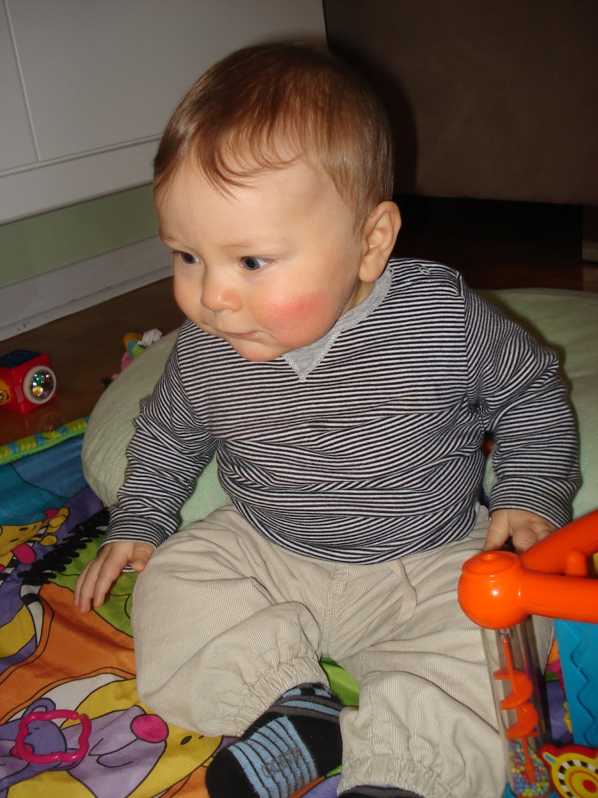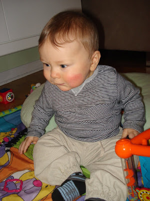 Et voila, Valentin a officiellement 6 dents, 4 en haut et 2 en bas. Bon, ça ne l'empêche pas de s'étouffer quand on lui donne un trop gros bout de pain, mais ça viendra... Il va bien, prend maintenant le biberon à 100% (je ne l'allaite plus), commence à manger un peu de tout, et adore ses 2 éducatrices. Il sourit beaucoup beaucoup ! Il babille, il adore son grand frère, il est facile. La belle vie (sauf encore un réveil trop matinal par nuit, mais on sait qu'il finira bien par faire la grasse mat un jour, comme tout le monde !)